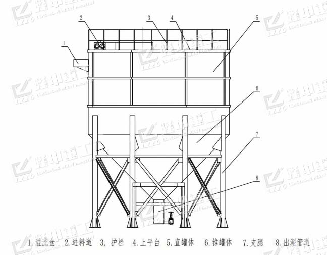 處理物料的廢水經(jīng)過料道進(jìn)入中心進(jìn)料筒,并經(jīng)過緩流、絮凝等一系列作用,使增稠的底流泥漿由罐體底部的出料口排出,并進(jìn)入壓濾機(jī)等其他設(shè)備,壓濾成泥餅。罐體上部產(chǎn)生清潔度較高的清水(溢流澄清液),由頂部的出水口排出,清水可循環(huán)利用,實(shí)現(xiàn)生產(chǎn)廢水零排放。